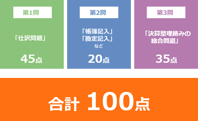 配点は第1問の仕訳問題が45点、第2問の帳簿記入、勘定記入問題が20点、第3問の決算整理絡みの総合問題が35点で合計100点となります。