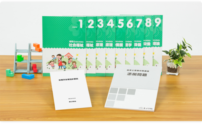 学習をサポートする副教材も充実!試験対策ができる「一問一答」「過去問題」や理解を深める「保育所保育指針」の解説書が付属され、どんな問題でも対応できるようになります!