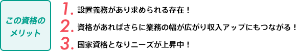 - 特定の事業を行う際に法律で設置が義務づけられている資格です。
