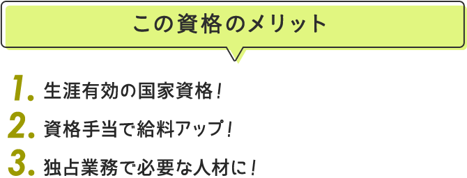 今、即戦力の人材を必要としている職場はたくさん!資格があれば、すぐに仕事に就きやすいということはもちろん、お給料の面でも優遇されることが多くメリットだらけ。なりたい!を確実に実現するのなら、急がば回れで資格取得が近道です。
